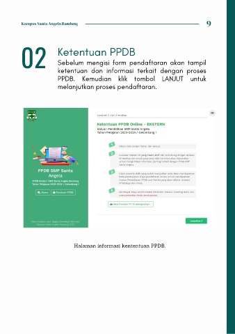 9 Kampus Santa Angela Bandung 02 Ketentuan PPDB Sebelum mengisi form pendaftaran akan tampil ketentuan dan informasi terkait dengan proses PPDB. Kemudian klik tombol LANJUT untuk melanjutkan proses pendaftaran. Halaman informasi kententuan PPDB.